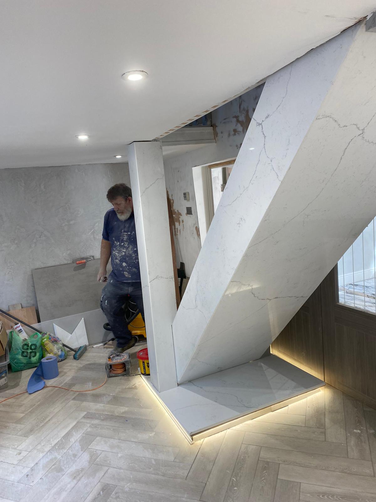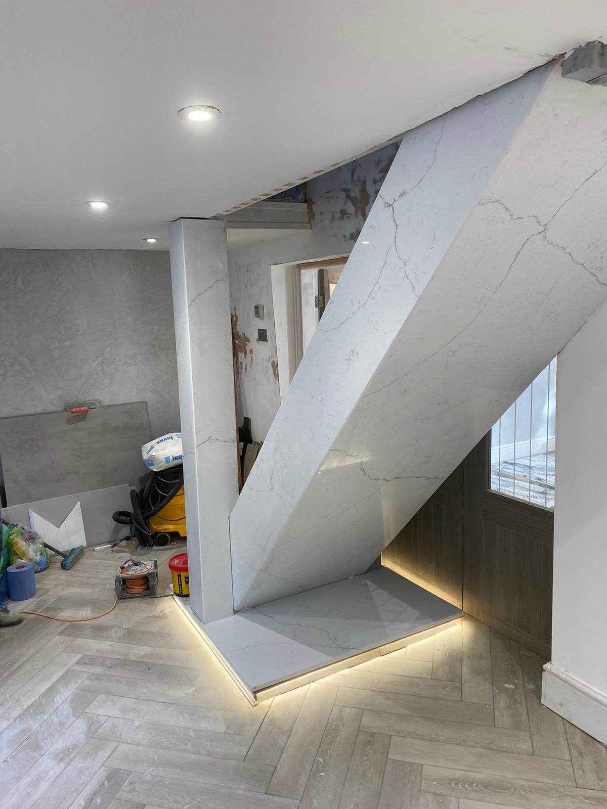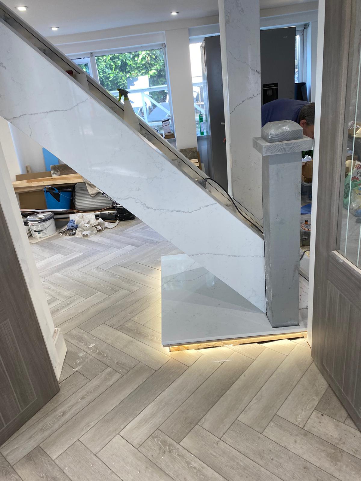 Our client wanted to turn an old wooden staircase into a sleek modern feature. Cladded in quarts and to be finished with Glass Balustrades.