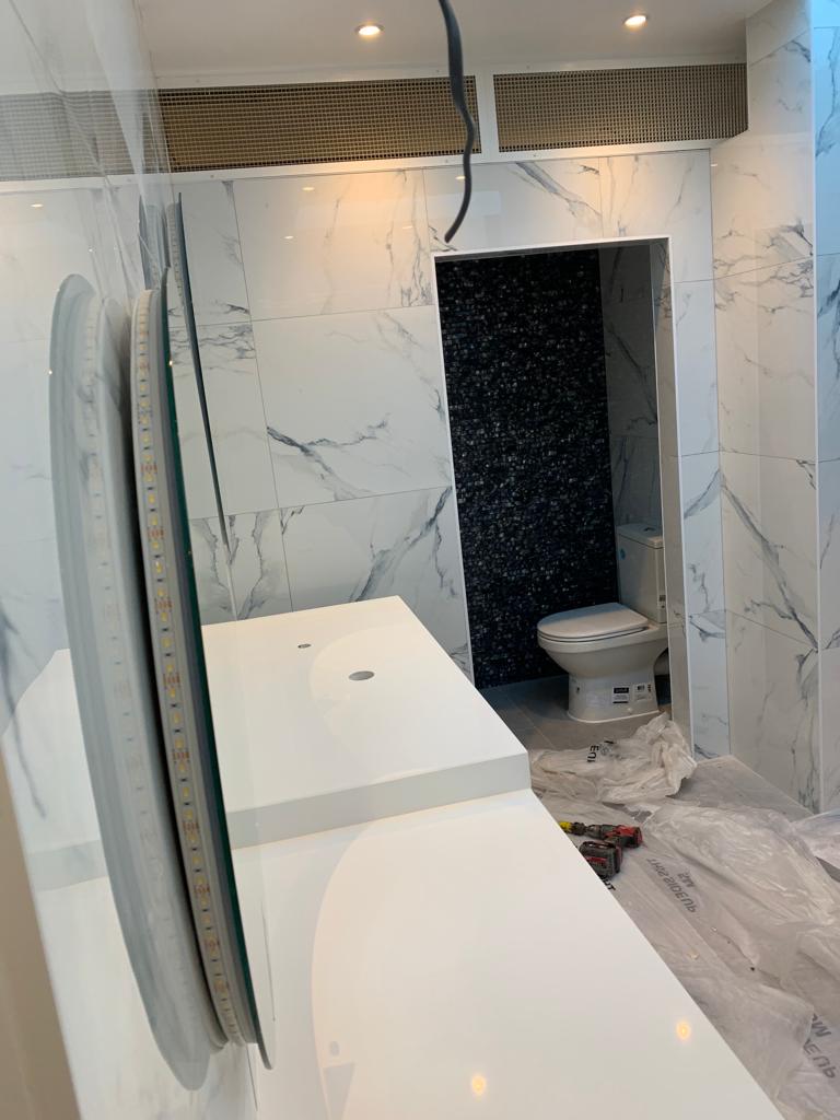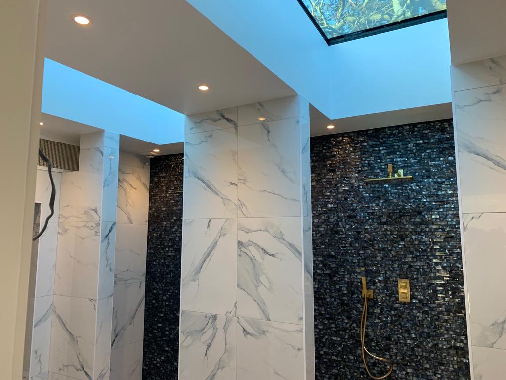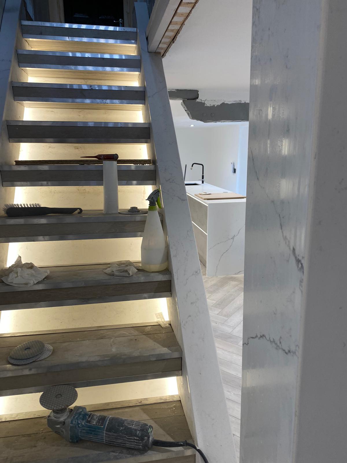 Our client wanted to turn an old wooden staircase into a sleek modern feature. Cladded in quarts and to be finished with Glass Balustrades.